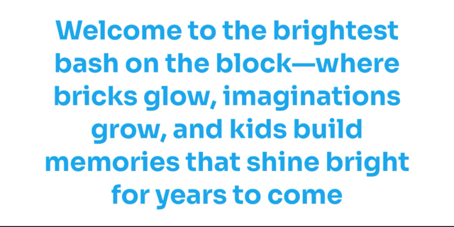 Step into a world where creativity meets color! This 3-hour party experience transforms your celebration into a glowing brick-building playground, complete with vibrant UV lighting, glow-in-the-dark bricks, and hands-on fun for all ages. Kids build, stack, and shine as they create glowing masterpieces-while parents kick back and enjoy the show.